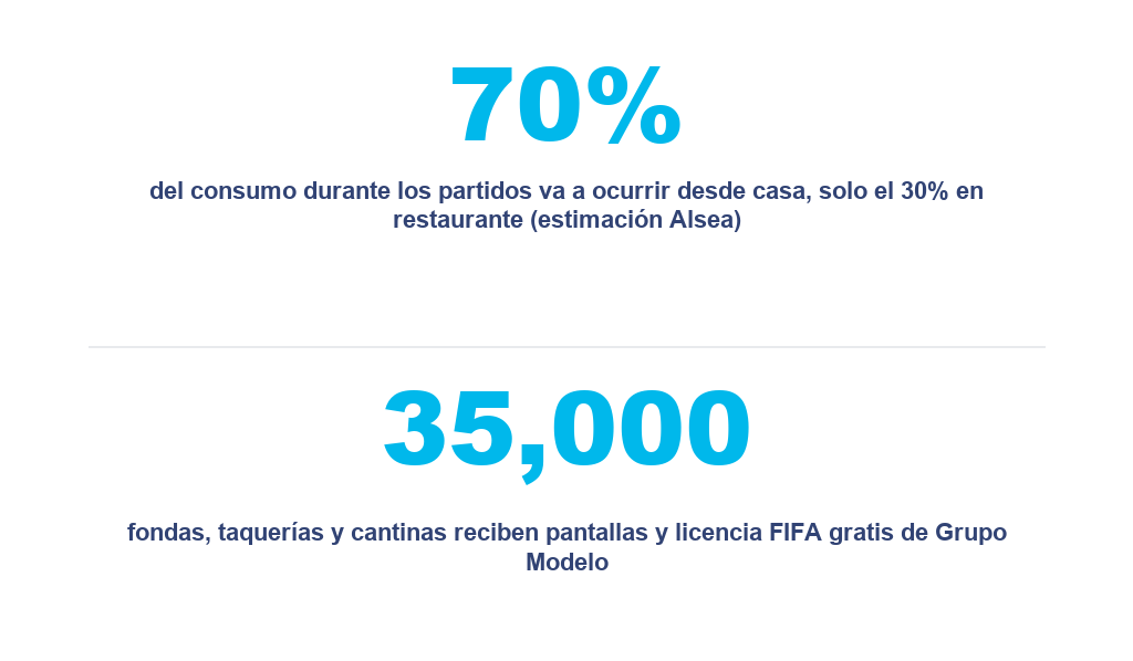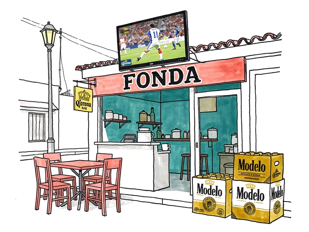 En los próximos 54 días, 35,000 fondas, taquerías, cantinas y tienditas de barrio en México van a recibir pantallas, refrigeradores, mobiliario y la licencia FIFA que necesitan para transmitir los partidos legalmente. Lo paga Grupo Modelo y lo coordina la Presidencia.